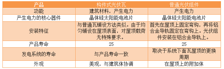 构件式光伏瓦 构建绿色发电家园 构件式光伏瓦是一款兼备光伏发电功能的建筑材料,是光伏建筑一体化即BIPV的应用形式之一,满足不漏水、易安装、易维护的要求。特别适用于家用、商用屋顶,以及各种棚顶。 构件式光伏瓦的独特性给光伏屋面阵列布局设计提供了很大的灵活性 简单快捷的安装方式创新性的构件设计,以及咬合,互锁的安装方式完美地满足了简单快速安装的需求。水平和垂直的安装方式都可以适用。完美的防水性构件式光伏瓦的防水理念和普通瓦是一样的,每块光伏瓦上都有导水槽,通过上下光伏瓦搭接,雨水向下流淌,确保了防水性。 便捷的维护由于构件式光伏瓦在屋面上形成了一个防水面,所以非常容易清洗。如果其中有一块电池组件损坏,无需全部拆除修理,可单片移动更换。符合建筑美学标准构件式光伏瓦更胜普通瓦片,科技感强,更显美观大气,将建筑学与美学完美地结合在一起。是光电建筑的优良解决方案, 构件式 光伏瓦